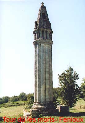 The "Tour du Morts" at Fenioux in the Charante-Maritime region of France is formed from nine circular columns with a very steep narrow spiral staircase inside. In the hillside below is a small shrine where bodies were laid out prior to burial, at night a lantern was lit in the top of the tower.