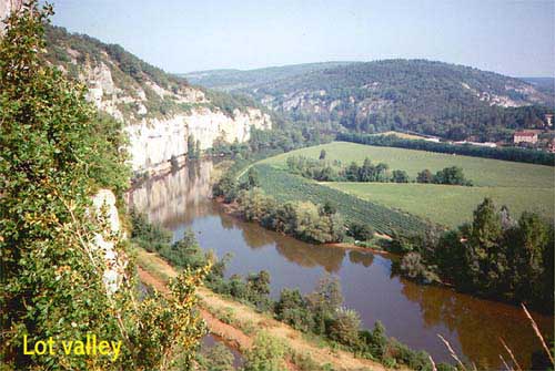 The Lot Valley, S.W. France, dotted with picturesque villages, limestone cliffs and caves. The important wine growing region of Cahors produced the favourite wines of the Russian Tsars.